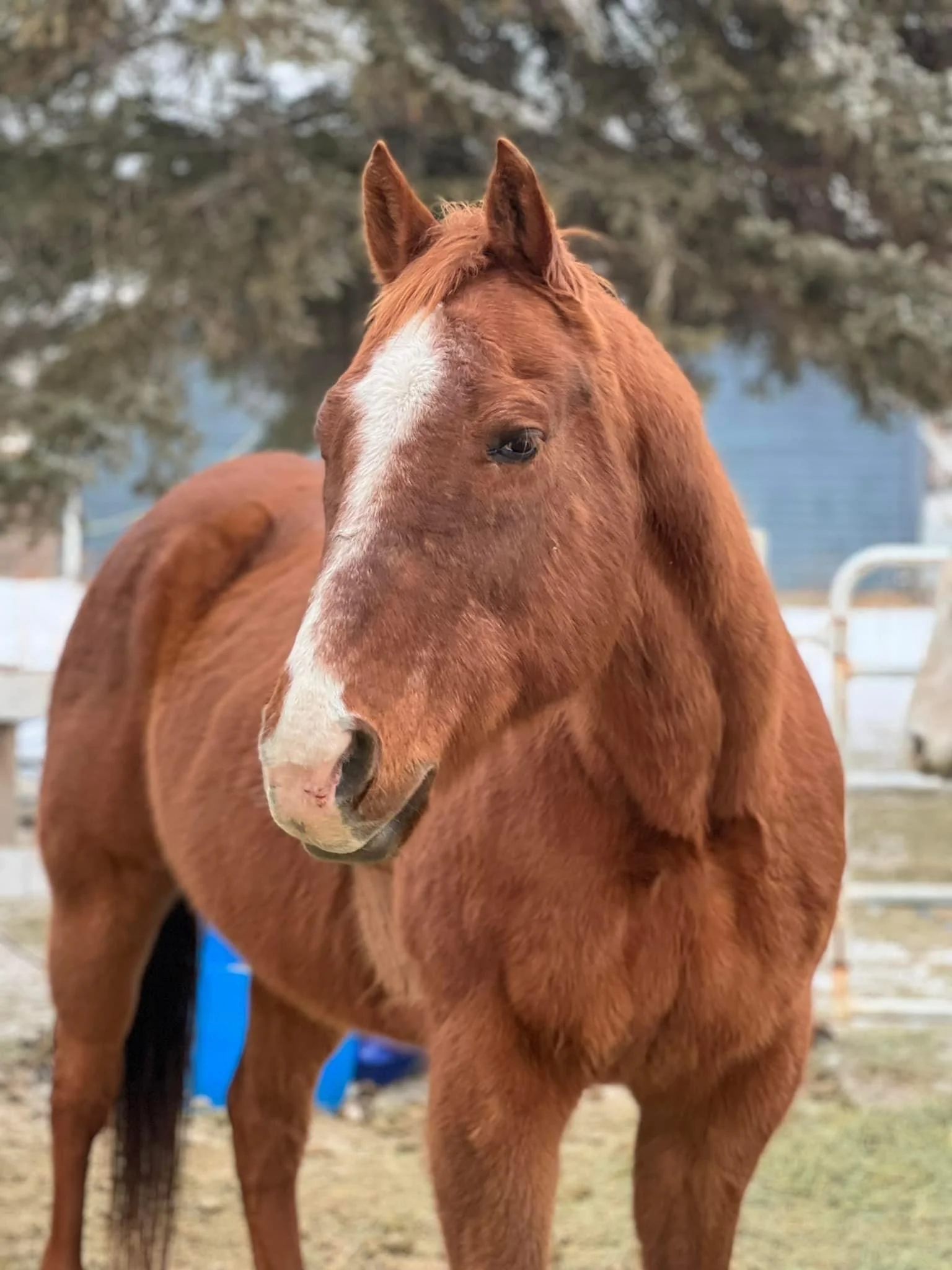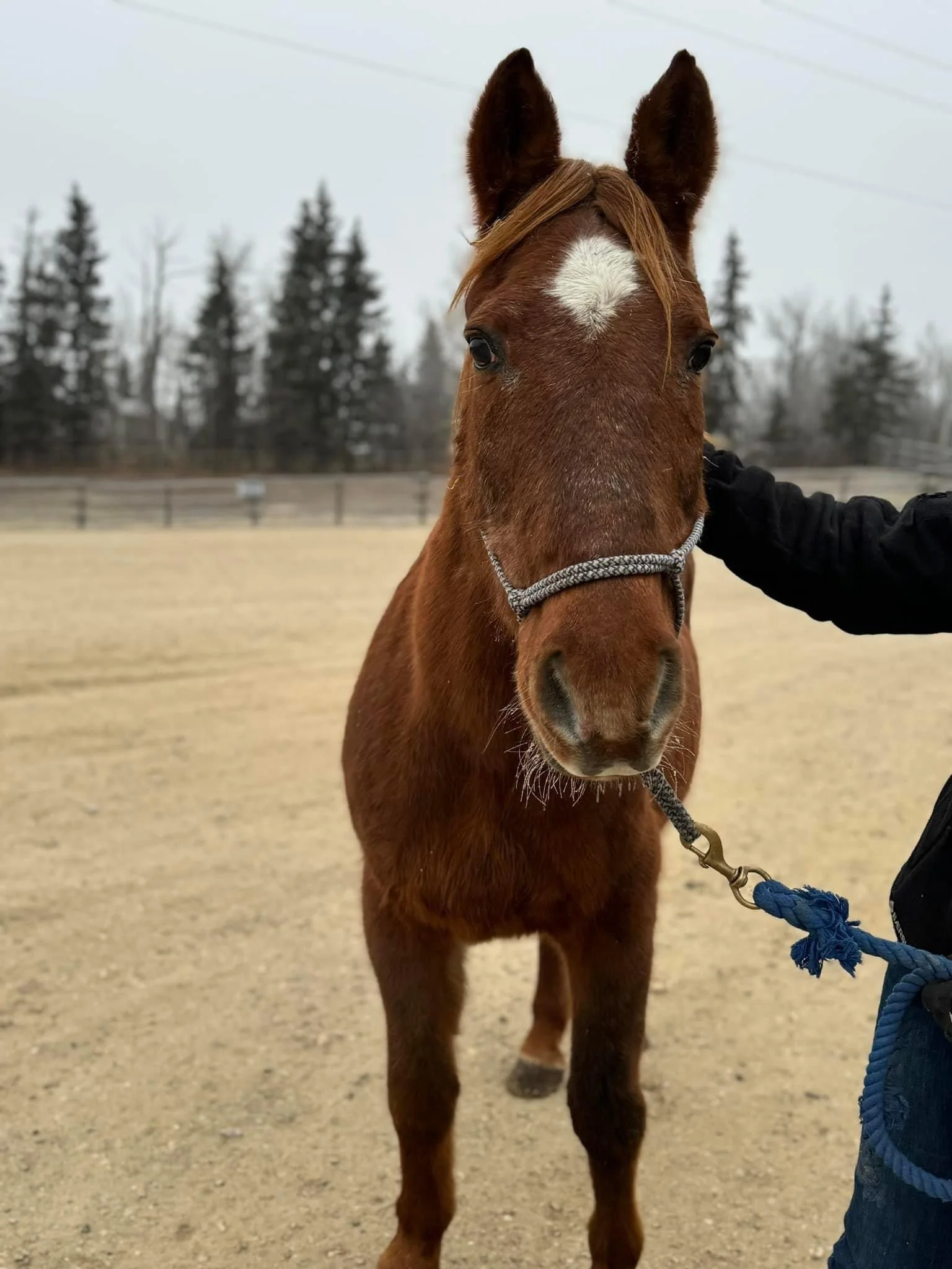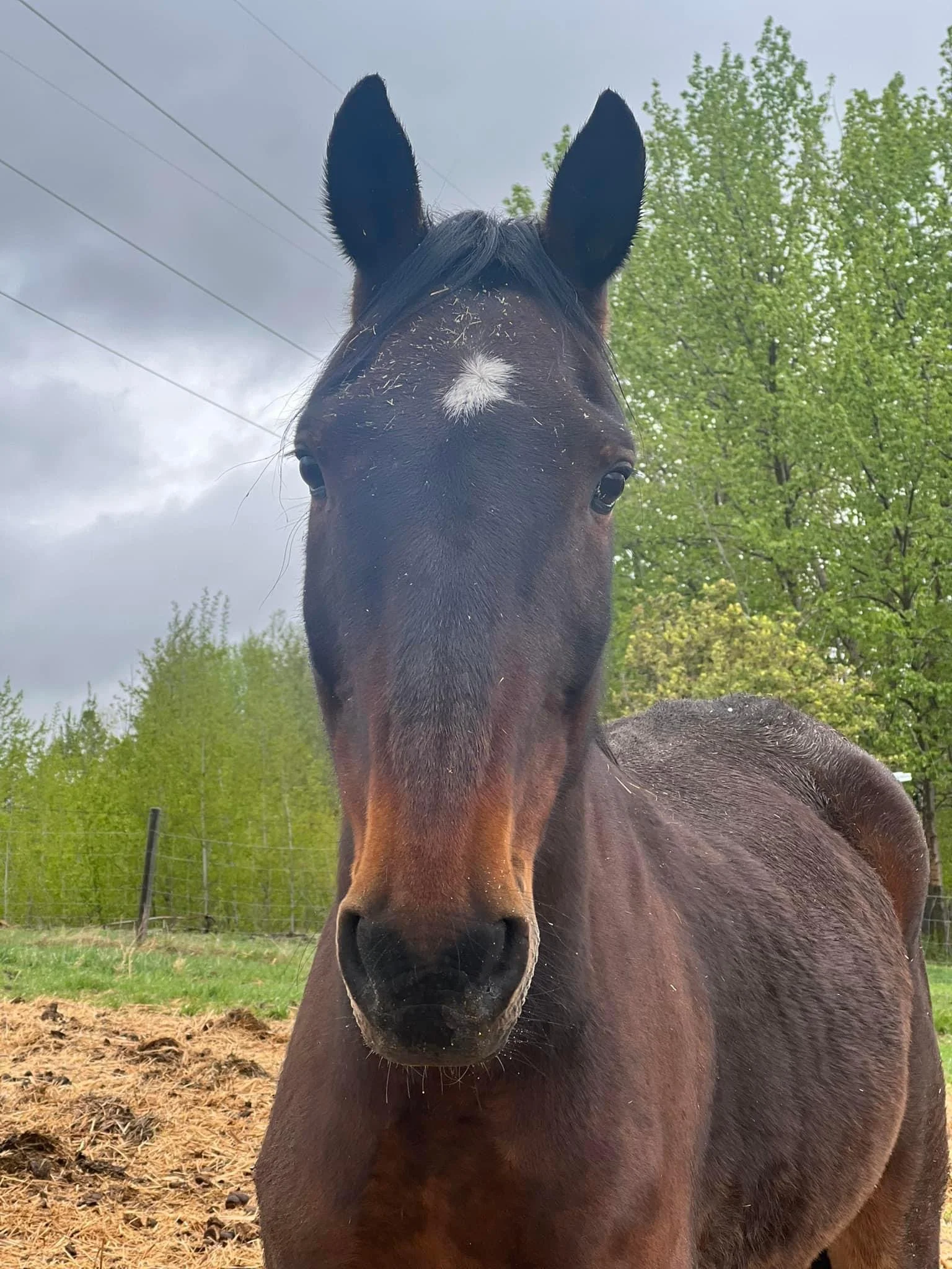 Rudolph was a beautiful nearly 30 year old gelding. He arrived to us by auction, with a significant heart murmur, old fractured ribs, minor arthritis and extremely sharp teeth. His knees started giving him a lot of problems, so we went forward with injections, which unfortunately didn’t help. In August 2023, Rudy was laid to rest. RIP our beautiful old man.